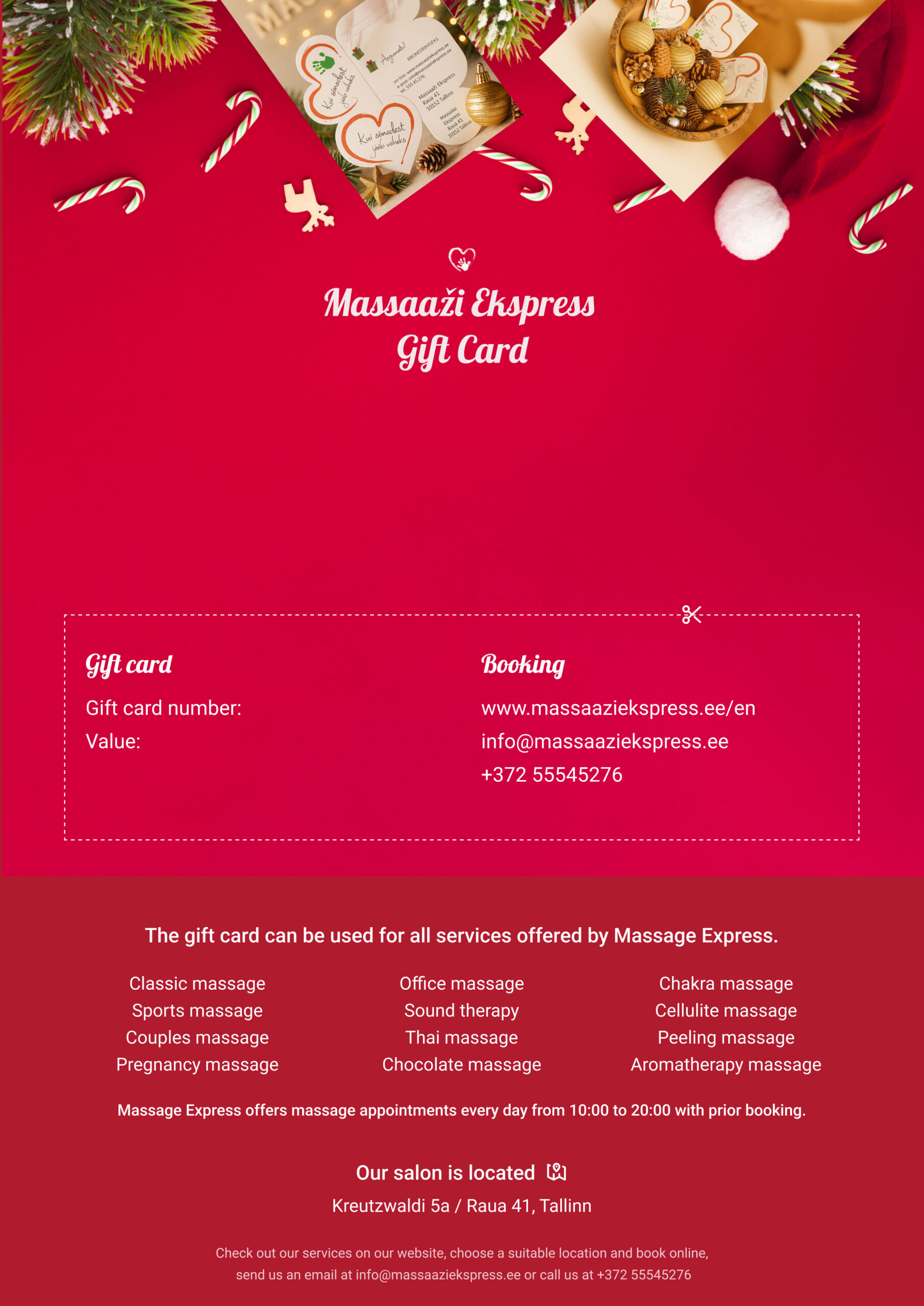 NB! Massage gift card is issued in the language selected by the user for buying card online. Preview a sample gift card before ordering.