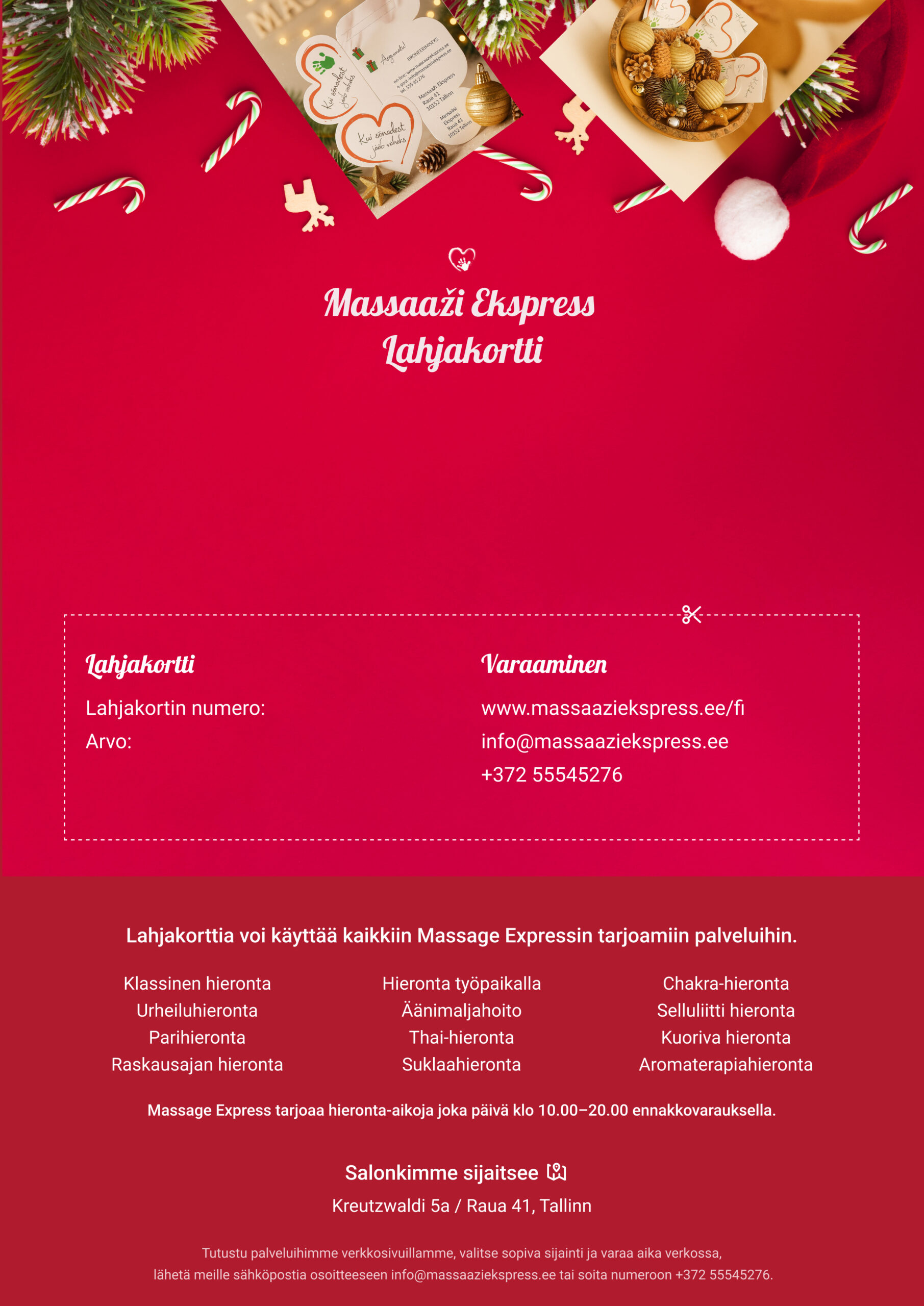 Huom! Hierontalahjakortti toimitetaan kortin ostajan valitsemalla kielellä. Voit tutustua esimerkkilahjakorttiin ennen ostamista.