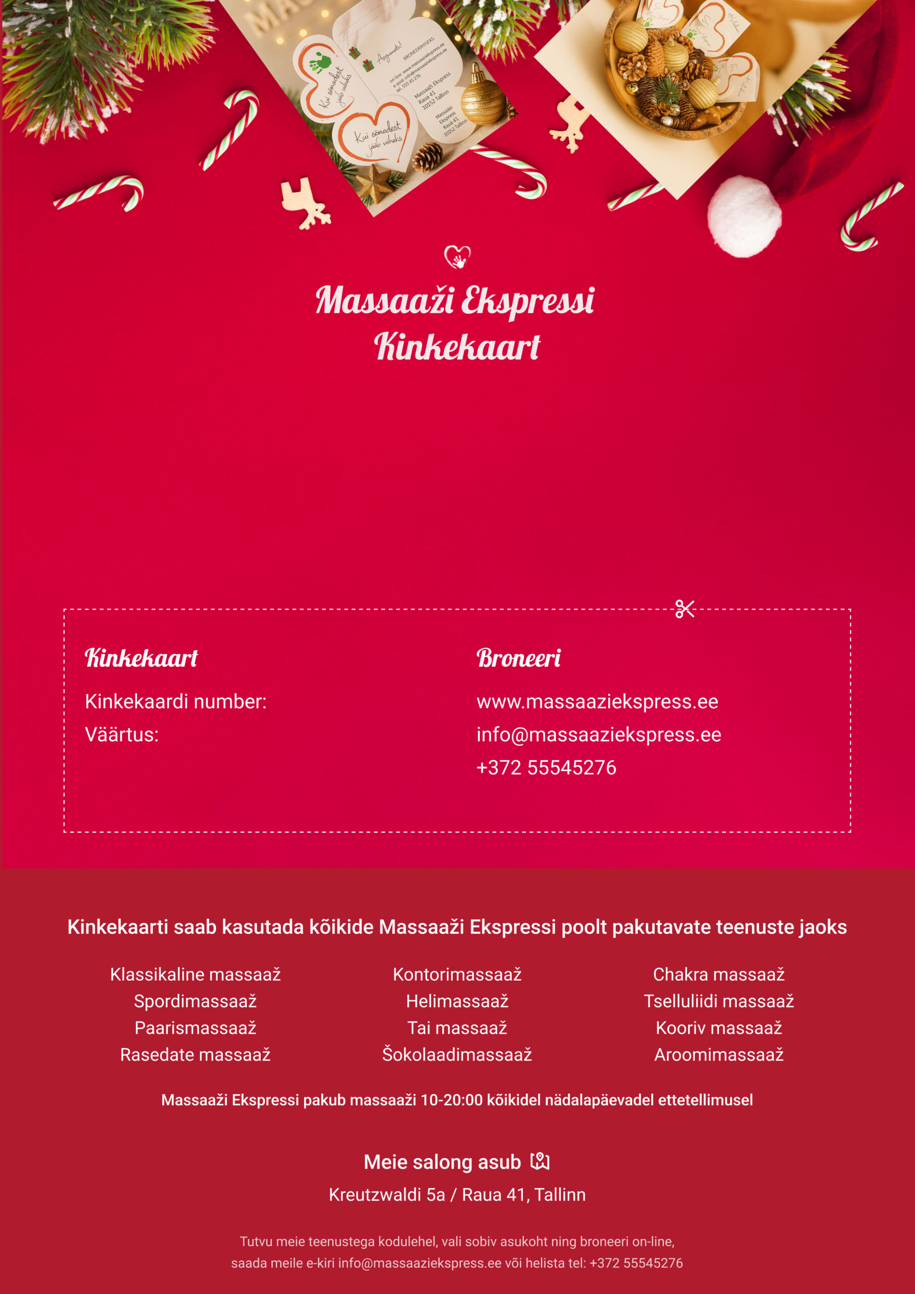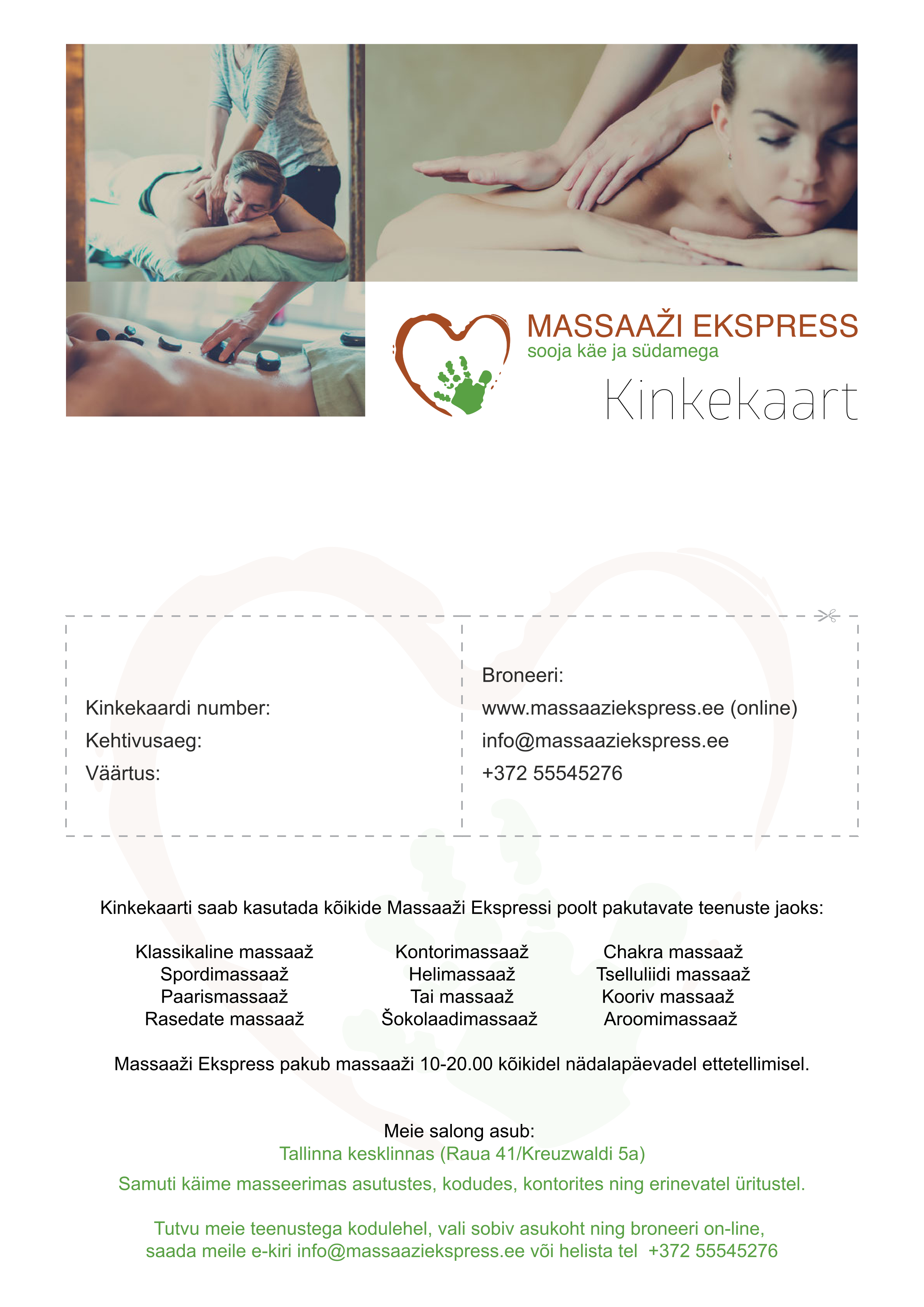 Massaaži Ekspressi kinkekaart on suurepärane kingitus kolleegidele, perele ja sõpradele. Pakume massaaži teenust ka eakatele, rasedatele ning erivajadustega inimestele. Kinkekaarti saab osta kõikide meie teenuste jaoks nii salongis, kodus kui ka kontoris. Vajadusel saadame kinkekaardi lisatasu küsimata posti teel.